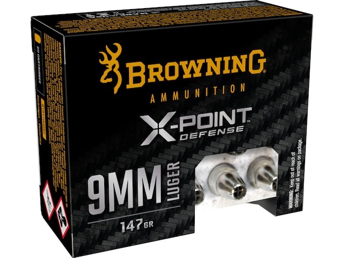 Browning BXP Personal Defense ammunition is designed for superior personal defense performance in reliability, expansion and penetration. The X-Point bullet is designed to shield the hollow point through intermediate barriers. This ammunition is new production, non-corrosive, in boxer-primed, reloadable nickel plated brass cases.