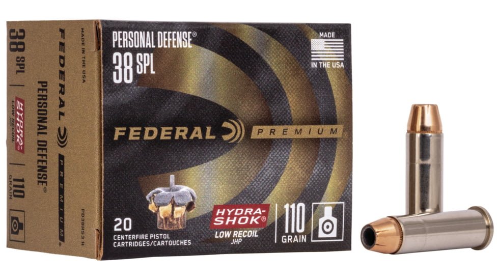 Specifications for Federal Premium Centerfire Handgun Ammunition .38 Special 110 grain Hydra-Shok Jacketed Hollow Point Centerfire Pistol Ammunition: