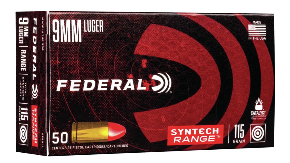 Caliber:9mm LugerNumber of Rounds:500Bullet Type:Syntech Total Synthetic Jacket (TSJ)Bullet Weight:115 grainMuzzle Velocity:1150 ft/sPrimer Location:Centerfire