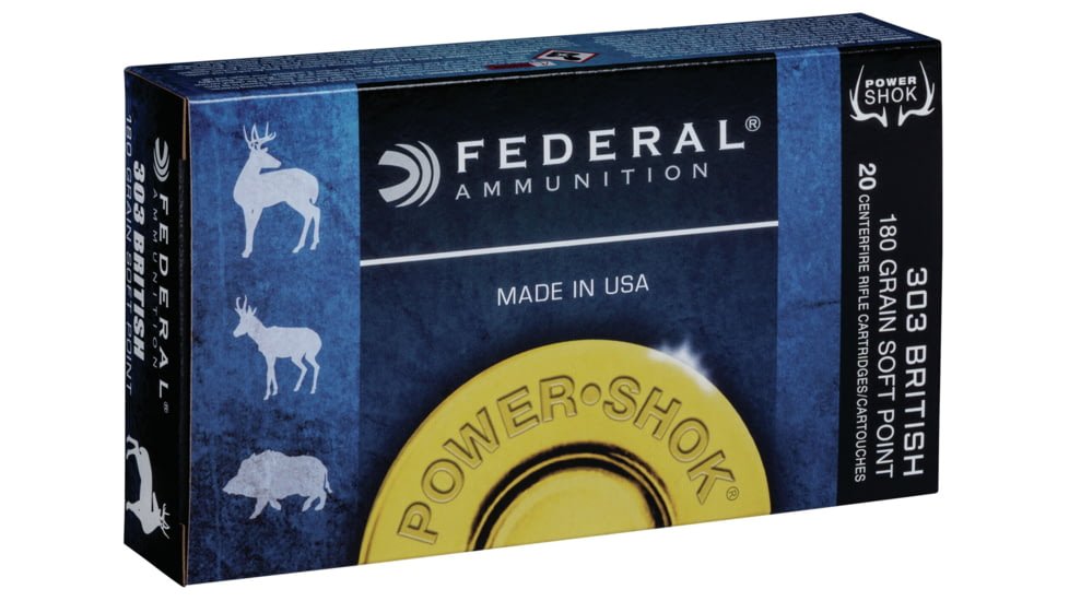 Specifications for Federal Premium Power-Shok .303 British 180 grain Jacketed Soft Point Centerfire Rifle Ammunition:
