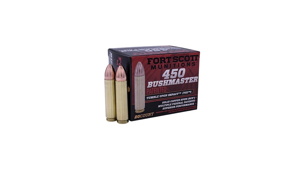 Fort Scott Munitions 450 Bushmaster TUI ammo is a match grade bullet made of solid copper and engineered to Tumble Upon Impact providing devastating stopping power. While designed as precision ammo for rifle hunters, our multi-patented Tumble Upon Impact technology also make them ideal rounds for home and self-defense or law enforcement. Fort 450 BUSHMASTER 250 Grain