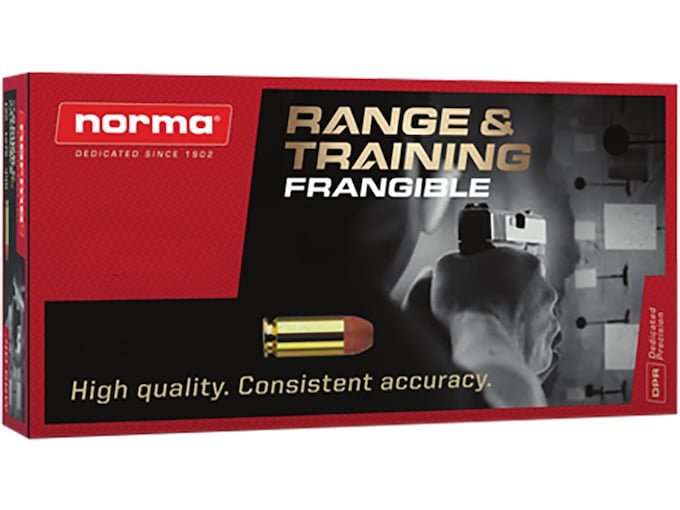 Norma Range & Training Frangible Ammunition features a projectile that is fully frangible that micro-pulverizes on hardened steel targets for realistic training. Norma Frangible Range is ideal for indoor or outdoor training with steel targets because it eliminates large fragments that could injure shooters, or damage sensitive range equipment. This allows for target shooting, competition and close quarters training in a completely large fragment free and shooter safe environment. This ammunition is new production, non-corrosive, in boxer-primed, reloadable brass cases.