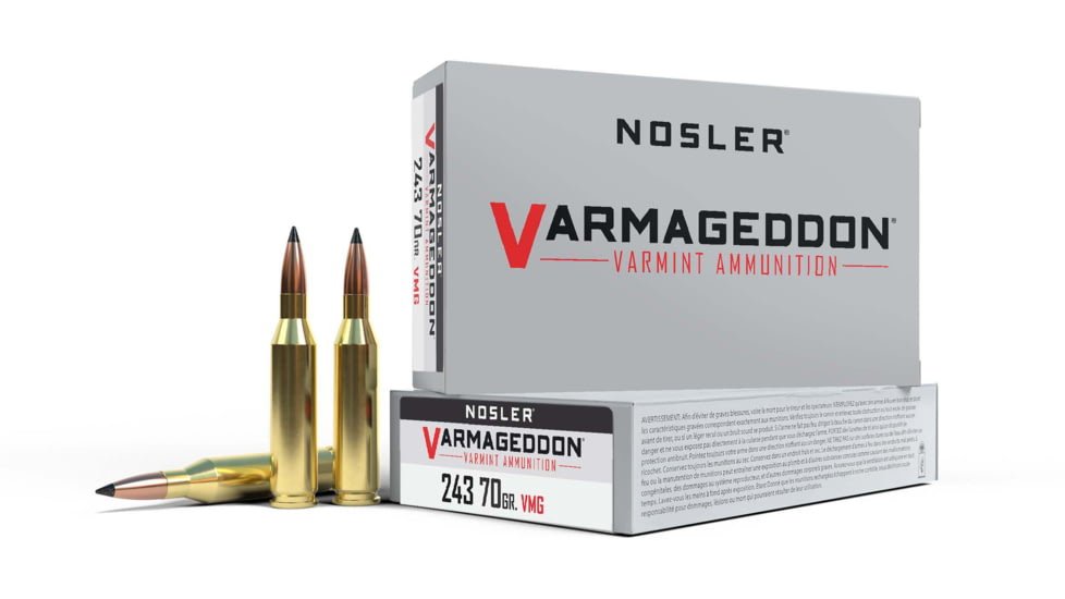 Noslers Varmageddon line of loaded ammunition and component bullets. Featuring a highly accurate polymer tip or hollow point combined with a flat base design, Varmageddon products were created for the high-volume varmint shooter who requires the utmost precision. Loaded with Nosler brass, Varmageddon ammunition provides the highest levels of performance for any varmint hunter.