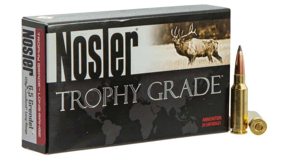 Specifications for Nosler Trophy Grade 6.5mm Grendel 129 Grain AccuBond Brass Cased Centerfire Rifle Ammunition: