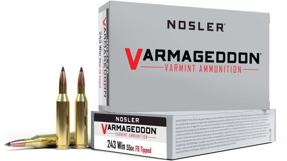 Product Info for Nosler Varmageddon .243 Winchester 55 Grain Flat Base Tipped Brass Cased Centerfire Rifle Ammunition