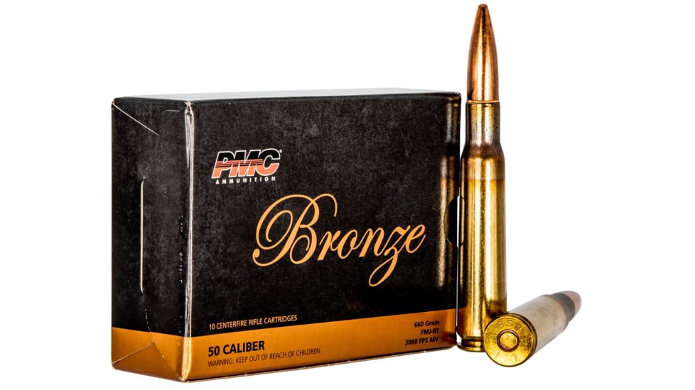 PMC 50A Bronze 50 BMG 660 gr Full Metal Jacket Boat Tail (FMJBT) 10 Bx/ 20 Cs – PMC’s Bronze Handgun Ammo is manufactured with the same quality and dependability built into the Starfire ammunition. All PMC cartridges must pass through the rigorous inspection of the electronic powder check station. If the propellant in any cartridge varies by as little as two-tenths of one grain, the system stops, and that cartridge is discarded.