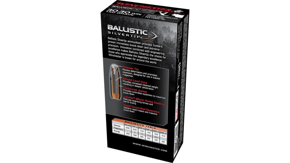 Specifications for Winchester BALLISTIC SILVERTIP .30-30 Winchester 150 grain Fragmenting Polymer Tip Centerfire Rifle Ammunition: